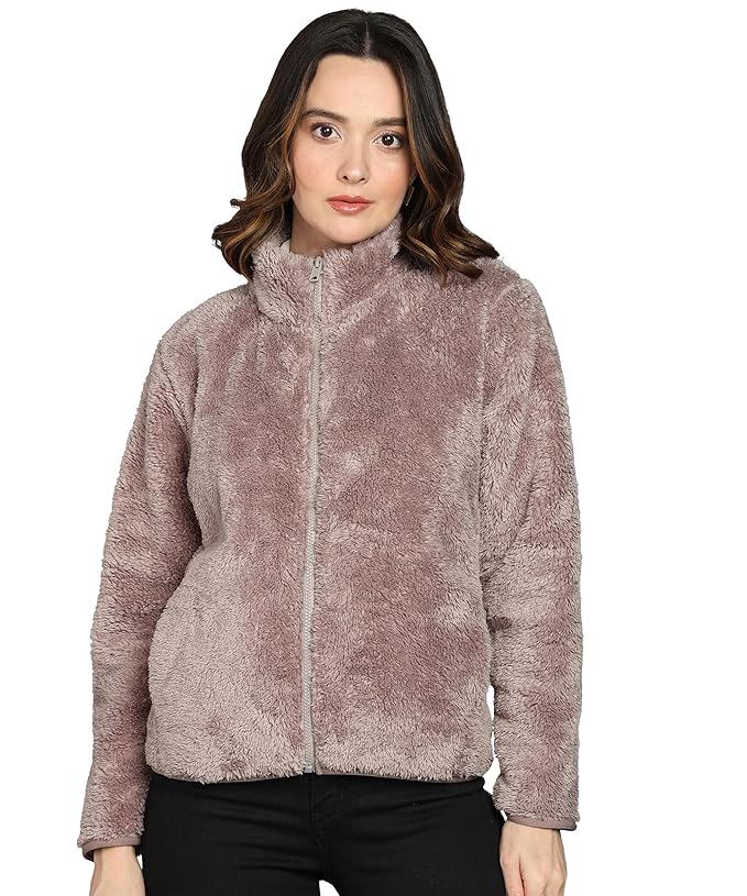 Alan Jones Clothing महिलांचे पॉलिस्टर फ्लफी यार्न फ्लीस फुल-झिप स्टँडर्ड लांबीचे जॅकेट