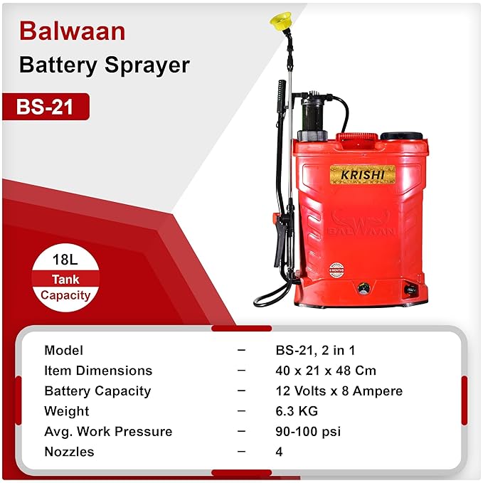 BALWAAN Krishi BS-21 Battery and Manual 2 in 1 Knapsack Sprayer 12 Volts x 8 Ampere | 18 litres Tank Capacity | High Pressure Sprayer | Suitable for Spraying
